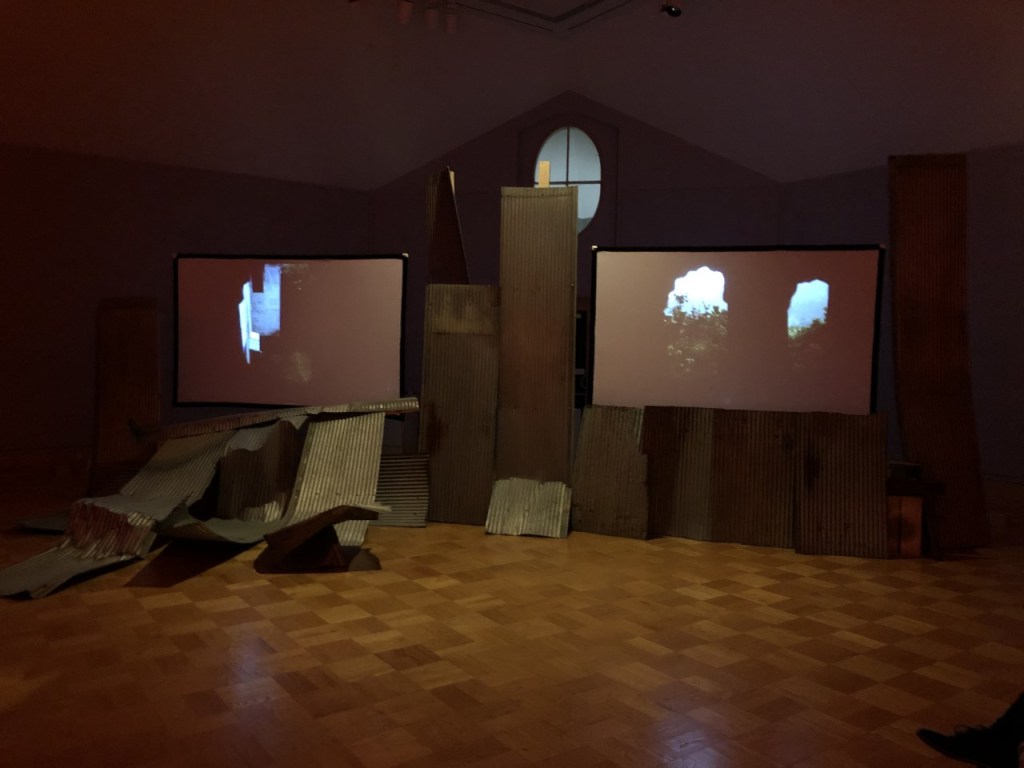 At first, the speaker, Maeve Jackson, talked about her two screening films. They are all about the same place in Europe that she went. The first one is artistic film, but the second one, she wanted to challenge herself by combining art and film (especially documentary) genre to create something different. I think the installation as a whole is very interesting. Since the screening needs projectors, she tokes some fallen barns from her grandpa’s house to decorate and frame the screening screen. There are also red light strings hanged to echo with the red vibe in the films.